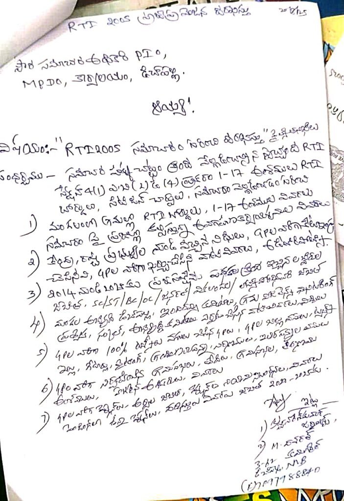 డిచ్పల్లి జై భారత్ ఆగస్టు 21 : (కట్ట నరేష్ నాయక్ ) నిజామాబాద్ రూరల్ మండలం డిచ్ పల్లి మండల పరిషత్ కార్యాలయంలో మండల అభివృద్ధి అధికారికి సమాచార హక్కు చట్టం 2005 పోరాట కమిటీ ఆధ్వర్యంలో ప్రజా ప్రయోజన దరఖాస్తు తేదీ 21/08/2025 నాడు 7 అంశాలు గురించిన కేంద్ర రాష్ట్ర ప్రభుత్వాలు నుండి వచ్చిన నిధులు, ప్రజా సంక్షేమ పథకాలు ప్రజలకు అందించే విదివిధనల గురించిన పారా దర్శకత జవాబు దారితనం తో ఎలా? పని చేశారు అనే విషయాలు గురించిన వివరాలు తెలుసుకోవడానికి సమాచార హక్కు చట్టాన్ని ప్రయోగించి వివరాలను సేకరించడమే కాకుండా ఏవైనా అవకతవకలు అవినీతి అక్రమాల పై చర్యలు తీసుకునే అవకాశాలు సైతం సమాచార హక్కు చట్టం ప్రకారం ప్రశ్నించడం కాదు పని చేసే విధానాన్న కూడా పౌరులు తెలుసుకొని సమాచార హక్కు చట్టం ద్వారా ప్రజల ప్రయోజనాల రిత్యా దరఖాస్తులు అందజేస్తున్న సమాచార హక్కు చట్టం పోరాట కమిటీ కార్యకర్తలు కు అండగా నిలిచే ఈ కమిటీ కార్యకర్తలు హక్కులు, వారికి అందించే సమాచారాన్ని ఇప్పించడమే కాకుండా వారి కి పిర్యాదులు పరిష్కారం అయ్యే విధంగా కృషి చేస్తామని సమాచార హక్కు చట్టం పోరాట కమిటీ వ్యవస్థాపక అధ్యక్షులు కట్టా నరేశ్ కుమార్ నాయక్ ఈ సందర్భంగా తెలిపారు.